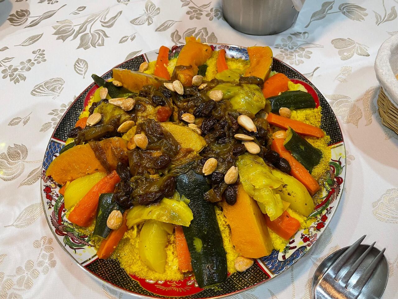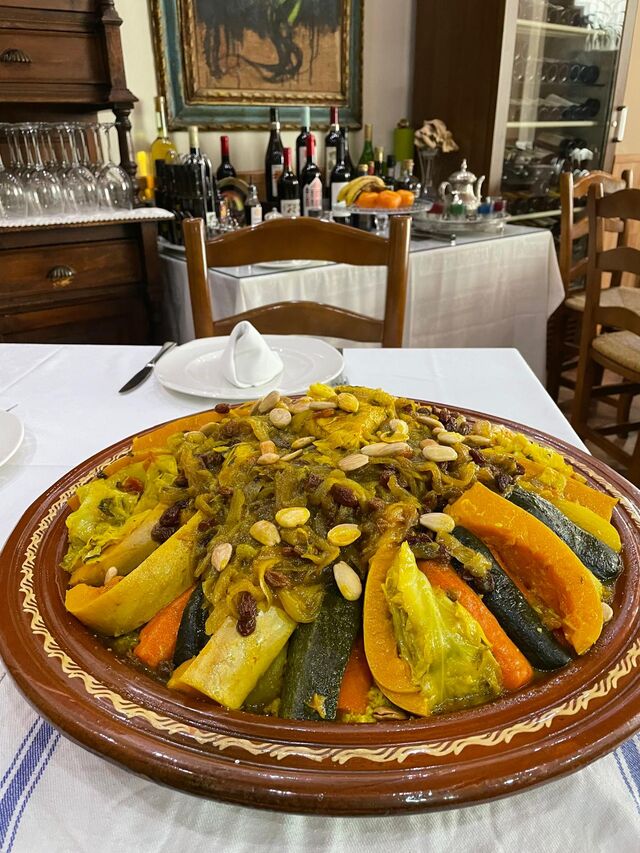 Su menú ofrece especialidades de cocina Mediterránea y marroquíes como cuscús (por encargo), tajines y pastela, junto con pescados a la plancha, carnes jugosas y tapas, entre ellas pinchitos morunos y una hamburguesa de autor. También cuenta con desayunos personalizados, acompañados de tés marroquíes, zumos y batidos naturales.